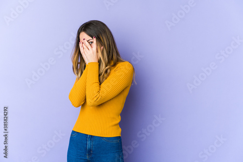 Young caucasian woman isolated on purple background blink through fingers frightened and nervous.