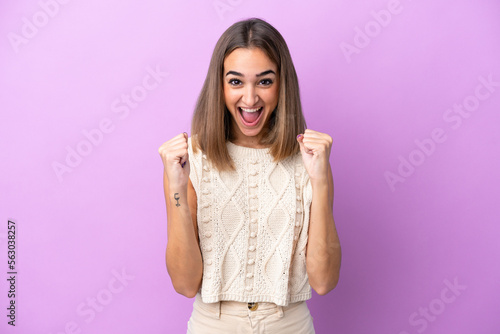 Young caucasian woman isolated on purple background celebrating a victory in winner position