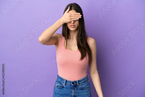 Young caucasian woman isolated on purple background covering eyes by hands. Do not want to see something
