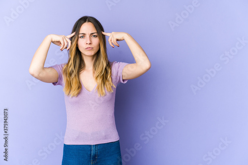 Young caucasian woman isolated on purple background focused on a task, keeping forefingers pointing head.