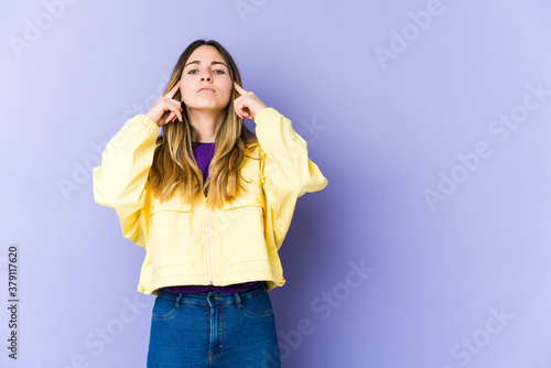 Young caucasian woman isolated on purple background focused on a task, keeping forefingers pointing head.