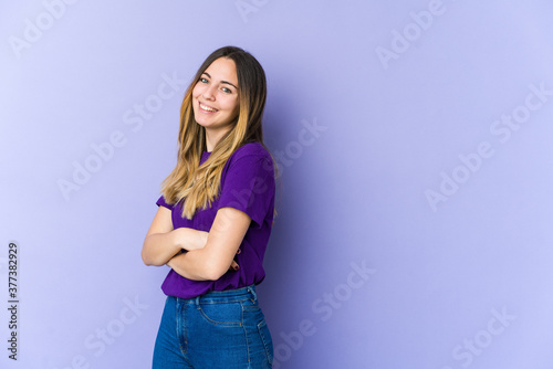 Young caucasian woman isolated on purple background happy, smiling and cheerful.