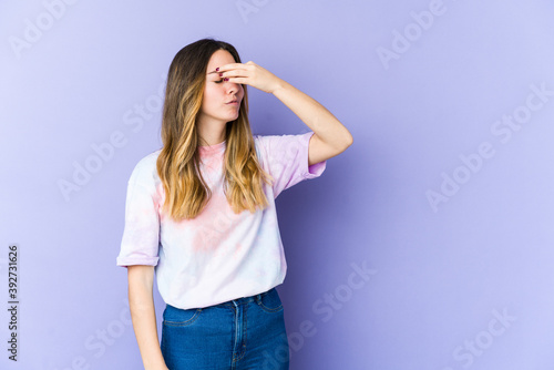 Young caucasian woman isolated on purple background having a head ache, touching front of the face.
