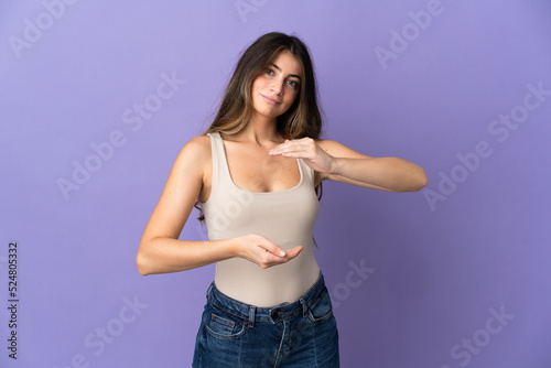 Young caucasian woman isolated on purple background holding copyspace imaginary on the palm to insert an ad
