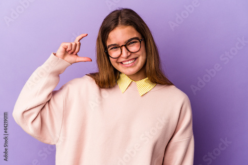 Young caucasian woman isolated on purple background holding something little with forefingers, smiling and confident.