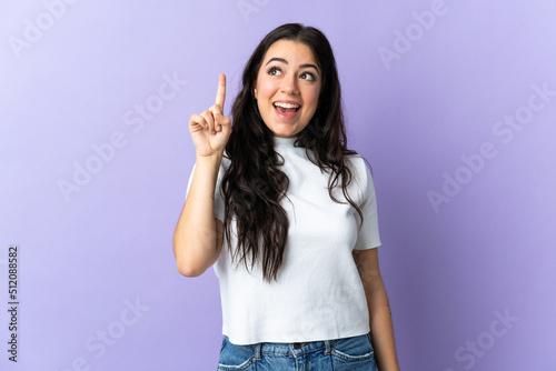 Young caucasian woman isolated on purple background intending to realizes the solution while lifting a finger up