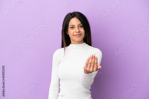Young caucasian woman isolated on purple background inviting to come with hand. Happy that you came