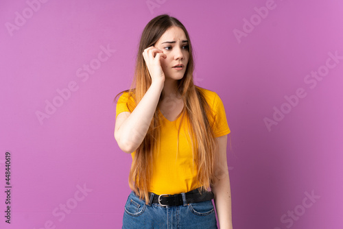 Young caucasian woman isolated on purple background is a little bit nervous