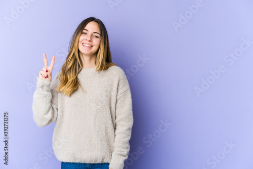 Young caucasian woman isolated on purple background joyful and carefree showing a peace symbol with fingers.