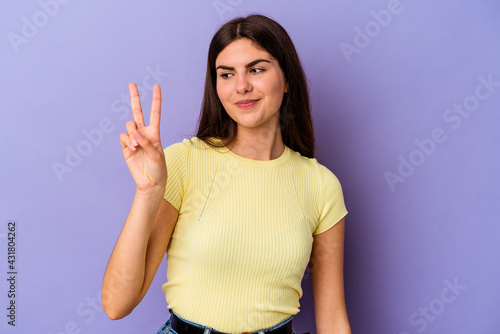 Young caucasian woman isolated on purple background joyful and carefree showing a peace symbol with fingers.