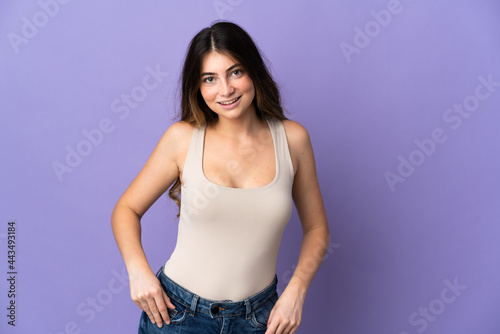 Young caucasian woman isolated on purple background laughing