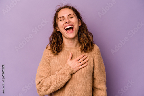 Young caucasian woman isolated on purple background laughs out loudly keeping hand on chest.