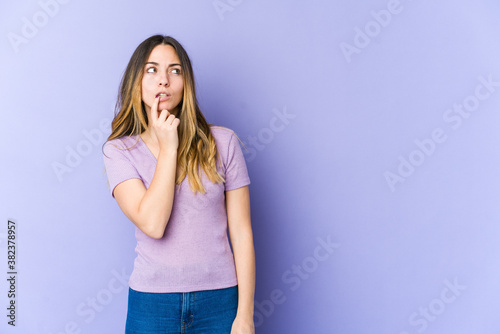 Young caucasian woman isolated on purple background looking sideways with doubtful and skeptical expression.