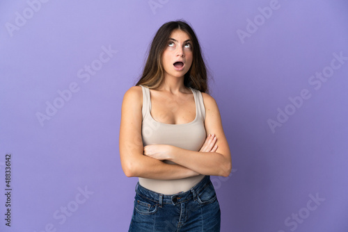 Young caucasian woman isolated on purple background looking up and with surprised expression