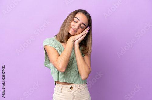 Young caucasian woman isolated on purple background making sleep gesture in dorable expression