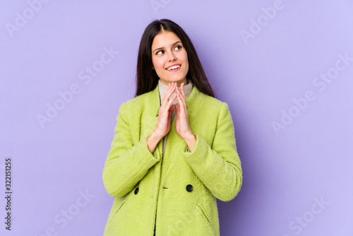 Young caucasian woman isolated on purple background making up plan in mind, setting up an idea.
