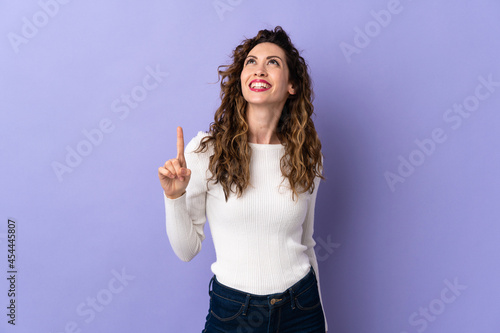 Young caucasian woman isolated on purple background pointing up and surprised