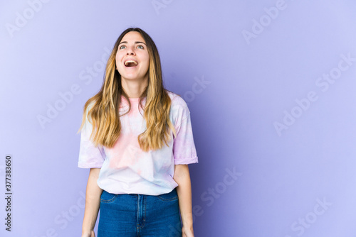 Young caucasian woman isolated on purple background shouting very angry, rage concept, frustrated.