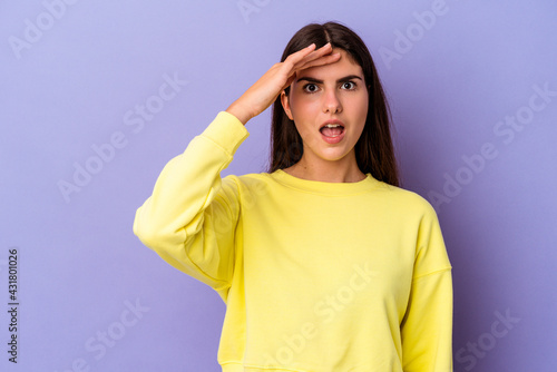 Young caucasian woman isolated on purple background shouts loud, keeps eyes opened and hands tense.