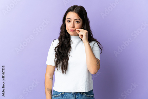 Young caucasian woman isolated on purple background showing a sign of silence gesture