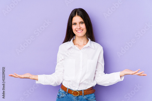 Young caucasian woman isolated on purple background showing a welcome expression.