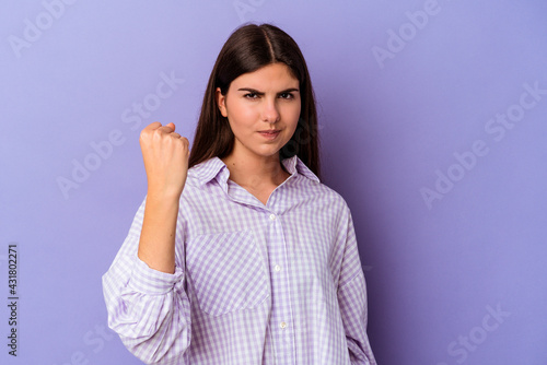 Young caucasian woman isolated on purple background showing fist to camera, aggressive facial expression.