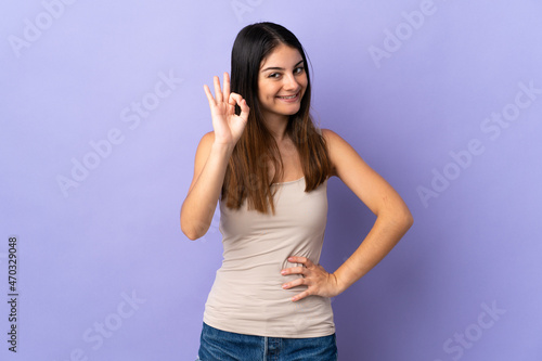 Young caucasian woman isolated on purple background showing ok sign with fingers