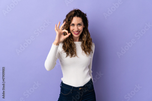 Young caucasian woman isolated on purple background showing ok sign with fingers