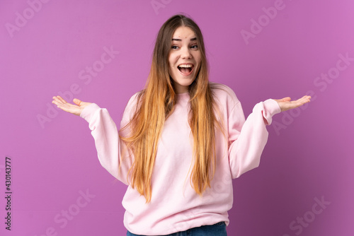 Young caucasian woman isolated on purple background smiling a lot