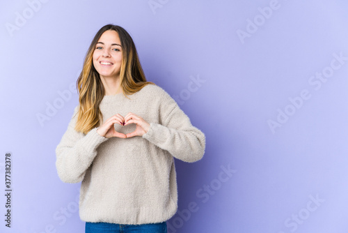 Young caucasian woman isolated on purple background smiling and showing a heart shape with hands.