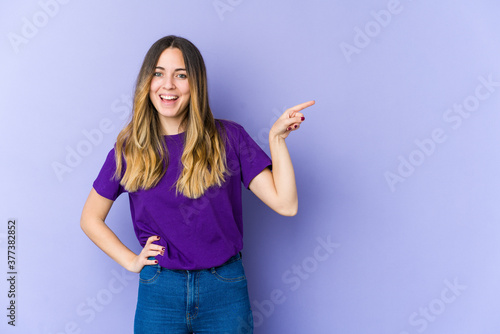 Young caucasian woman isolated on purple background smiling cheerfully pointing with forefinger away.