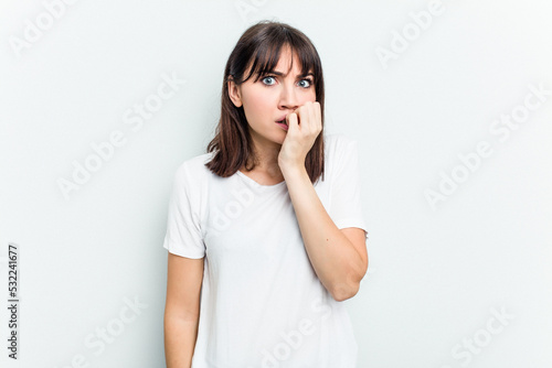 Young caucasian woman isolated on white background biting fingernails, nervous and very anxious.