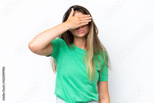 Young caucasian woman isolated on white background covering eyes by hands. Do not want to see something