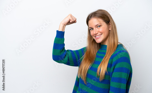 Young caucasian woman isolated on white background doing strong gesture