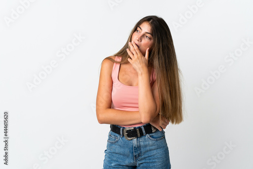 Young caucasian woman isolated on white background doing surprise gesture while looking to the side