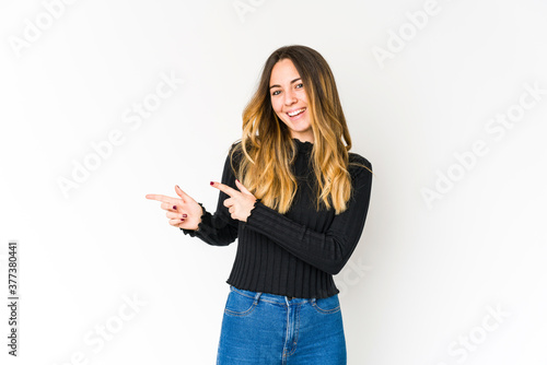 Young caucasian woman isolated on white background excited pointing with forefingers away.