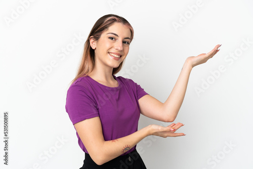 Young caucasian woman isolated on white background extending hands to the side for inviting to come