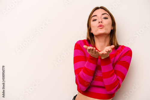 Young caucasian woman isolated on white background folding lips and holding palms to send air kiss.