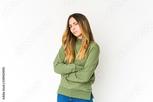 Young caucasian woman isolated on white background frowning face in displeasure, keeps arms folded.