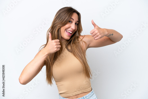 Young caucasian woman isolated on white background giving a thumbs up gesture