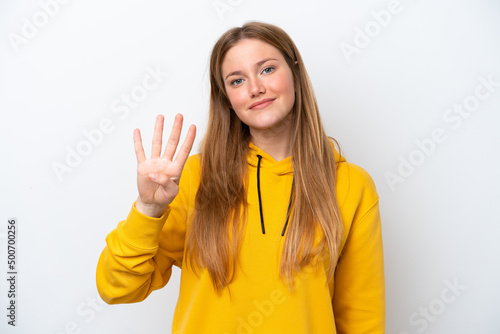 Young caucasian woman isolated on white background happy and counting four with fingers
