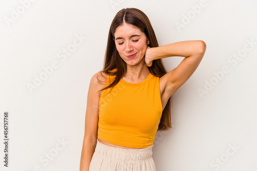 Young caucasian woman isolated on white background having a neck pain due to stress, massaging and touching it with hand.