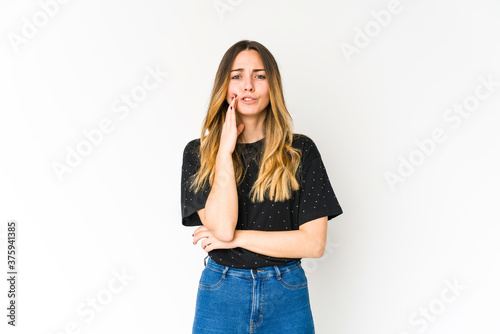 Young caucasian woman isolated on white background having a strong teeth pain, molar ache.