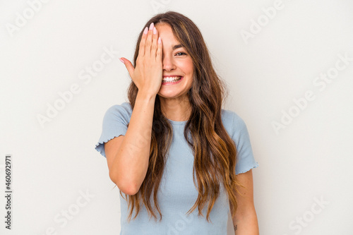 Young caucasian woman isolated on white background having fun covering half of face with palm.