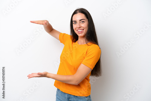 Young caucasian woman isolated on white background holding copyspace to insert an ad