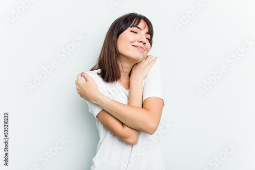 Young caucasian woman isolated on white background hugs, smiling carefree and happy.