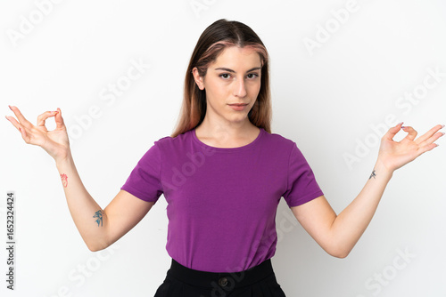 Young caucasian woman isolated on white background in zen pose