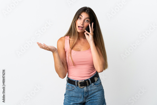 Young caucasian woman isolated on white background keeping a conversation with the mobile phone with someone