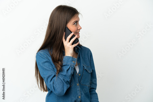 Young caucasian woman isolated on white background keeping a conversation with the mobile phone with someone