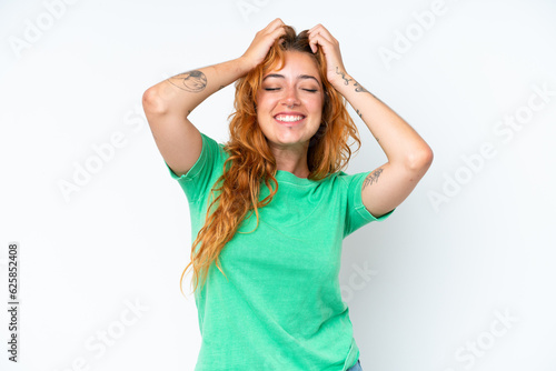Young caucasian woman isolated on white background laughing